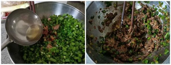 第三步:肉餡中放入鹽、生抽、老抽、蠔油,然后燒點熱油淋在蔥上面,再放入一勺芝麻油,把肉餡拌勻腌制一會兒。