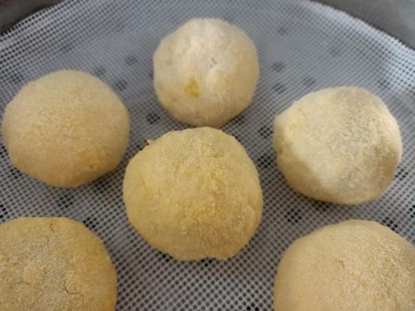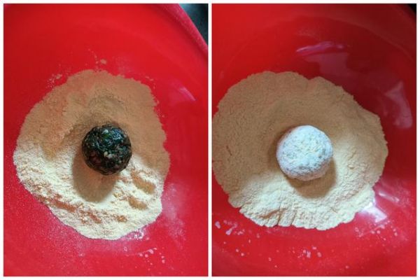 第五步:冷凍2小時左右,摸著團(tuán)子變硬了,不會散開了就可以操作了。拿一個盆兒,把玉米面放進(jìn)去,團(tuán)子放進(jìn)玉米面里面,搖動盆子使丸子表面沾滿玉米面。