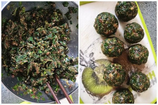 第四步:擠干水分的薺菜切碎,放入肉餡中,拌勻。下手把肉餡挨個揉成圓球狀,大小隨意,不要太大,不然待會不好蒸熟。揉好的團(tuán)子蓋上保鮮膜放入冰箱冷凍。