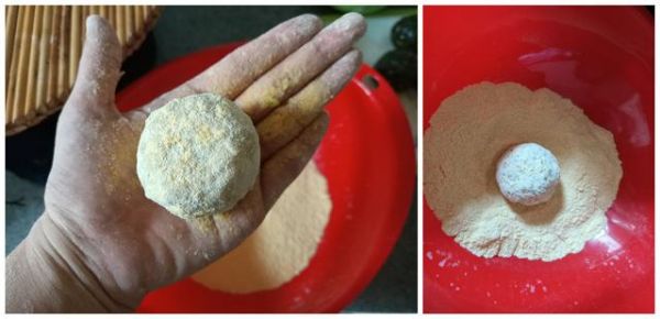 玉米面沒有黏性,如果像包包子那樣去包呢,肯定沒法包裹,都會斷裂破開。采用這個搖晃粘干粉的方法完美解決了這個問題。有的小伙伴說可以在和面時加入一些面粉啊,可是加入面粉那就不是傳統(tǒng)懷舊味道的玉米面菜團(tuán)子了。想要嘗一口老味道的小伙伴可以試試我這個方法呦。