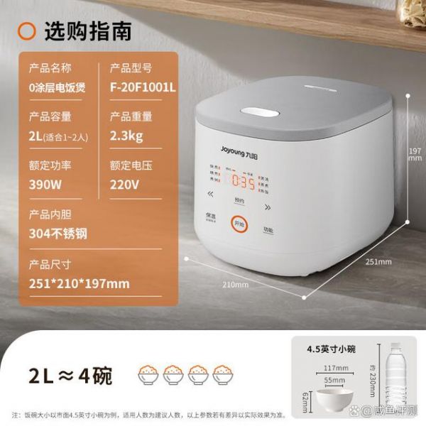 九陽(yáng)(Joyoung)2L精致1-2人家用電飯煲F-20F1001L,以其卓越的設(shè)計(jì)和實(shí)用的功能,成為了現(xiàn)代廚房中不可或缺的智能家電。這款電飯煲大的亮點(diǎn)在于其內(nèi)膽采用了0涂層304不銹鋼材質(zhì),不僅健康安全,而且耐用性極強(qiáng),有效避免了涂層脫落可能帶來(lái)的健康隱患。2升的容量設(shè)計(jì),恰到好處地滿(mǎn)足了1-2人家庭的需求,既不浪費(fèi)空間,又能確保每餐都能享用新鮮美味的米飯。