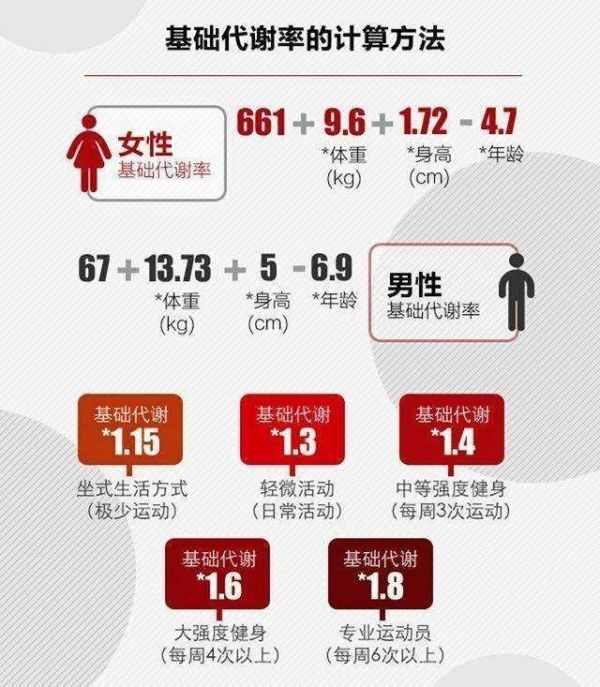 通過減少食物的攝入來減肥,最好不要低于自身的基礎(chǔ)代謝,否則身體就會啟動自我保護(hù)機(jī)制,不易減肥。如果不知道基礎(chǔ)代謝怎么算,可以參考下圖。