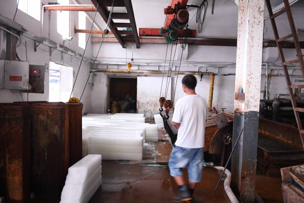 一大早,新發(fā)地市場制冰場車間內(nèi),龍門吊正在起吊已經(jīng)制成的冰塊。工作人員將一排方型的冰桶從空中吊入洗冰脫模的水池后,再吊到倒冰架脫水,一塊塊重達(dá)100公斤的大冰塊就會爭相滑到地面。有的商戶需要購買整塊的大冰塊,將其放入廂式貨車內(nèi)降溫,“一塊30塊錢,買三塊,放進(jìn)車廂內(nèi)能管一天?!币晃簧虘趄T著三輪車過來購買了三塊冰,一邊用繩子捆扎冰塊一邊說道。