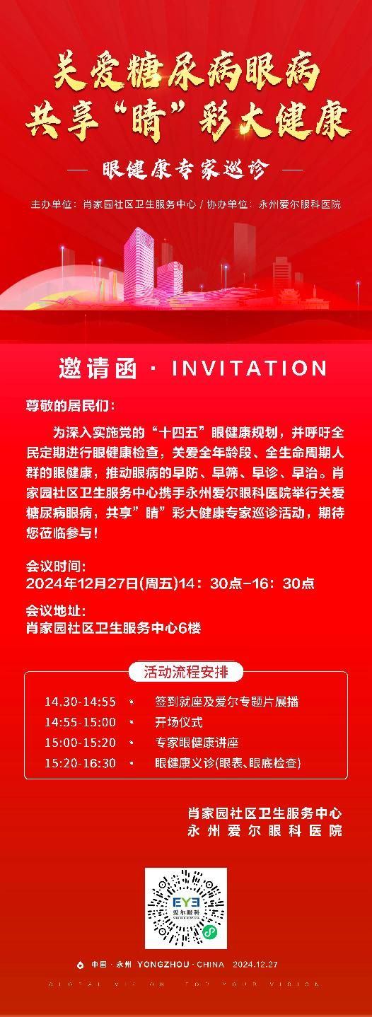健康是幸福的基石,關(guān)愛從了解開始。12月27日,肖家園社區(qū)衛(wèi)生服務(wù)中心6樓,我們不見不散!讓我們一起行動(dòng)起來,關(guān)愛糖尿病眼病,共享“睛”彩大健康,讓生活的每一刻都充滿光明與希望!