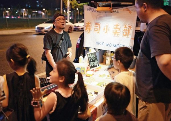 2023年8月17日,浙江省紹興市越城區(qū)五云北路后備箱集市一名攤主在售賣壽司