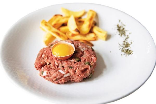 這是2021年1月30日在法國里爾拍攝的法國名菜“韃靼牛肉”配炸薯條