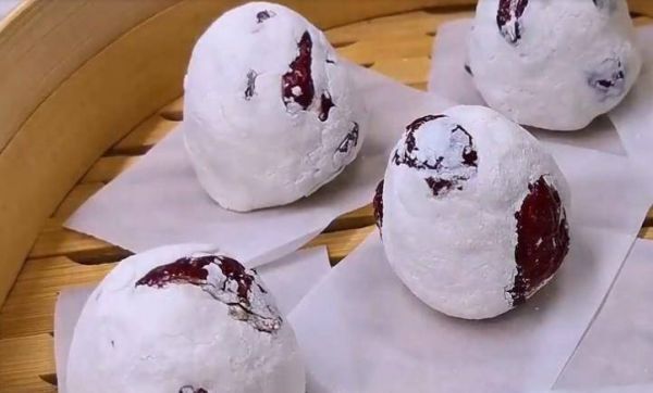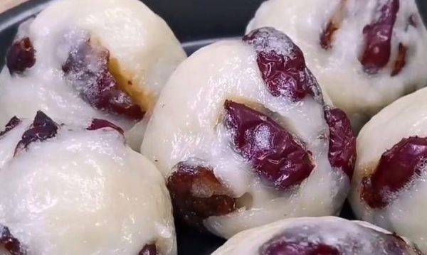 2、提前準備大約200克左右的紅棗,清洗干凈去核,然后在中間對半切開,放入糯米粉中,翻拌均勻。然后捧上1把糯米粉用力地攥成團,最后攥成小饅頭的形狀,一個年糕的生坯就做好了。