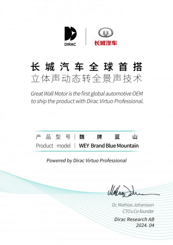 攜手?jǐn)?shù)字音頻先驅(qū)Dirac 長(zhǎng)城汽車實(shí)現(xiàn)「立體聲動(dòng)態(tài)轉(zhuǎn)全景聲技術(shù)」汽車行業(yè)全球首搭