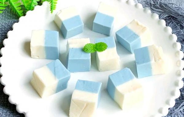 4.剩下的奶液加入藍莓粉攪拌均勻,倒入冷藏成型的淡奶層果凍上面,放入冰箱冷藏兩小時以上,凝固后切塊。