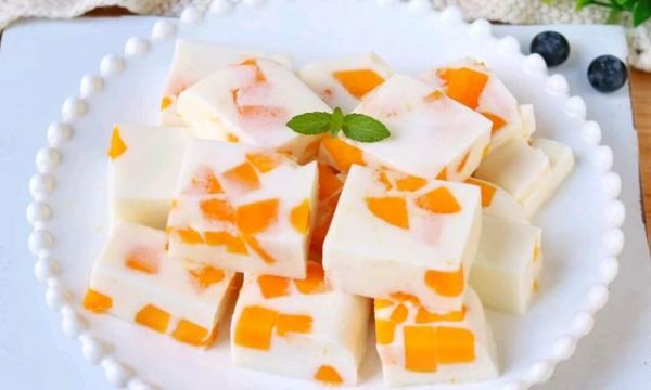 2.芒果切成丁,倒入玻璃碗中,倒入牛奶液攪拌均勻,放涼后放入冰箱冷藏幾個小時。