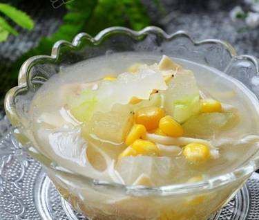 材料:冬瓜400g、熟玉米粒50g、蘑菇100g 、油適量、鹽適量、味精適量、香油適量