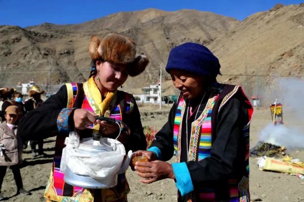 大年初一,睜眼醒來就要喝熱“滾顛”——青稞酒內(nèi)加紅糖、奶渣和磨碎的青稞。吊唁死者也要攜酒前往。迎賓送客時(shí),藏家人全家都排列在門前,向來客獻(xiàn)哈達(dá)和青稞酒,這是最尊貴的禮節(jié)。