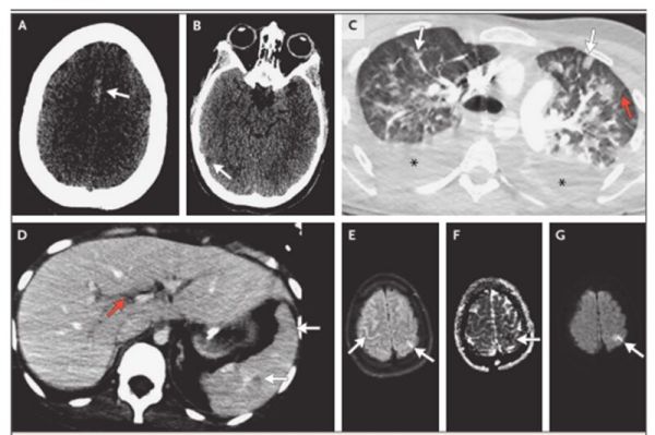 按照病毒綜合征治療無效后,患者頭痛惡化,新發(fā)畏光癥,出現(xiàn)食欲不振、干咳與輕度運動后的呼吸困難,繼發(fā)思維與言語混亂、嗜睡。