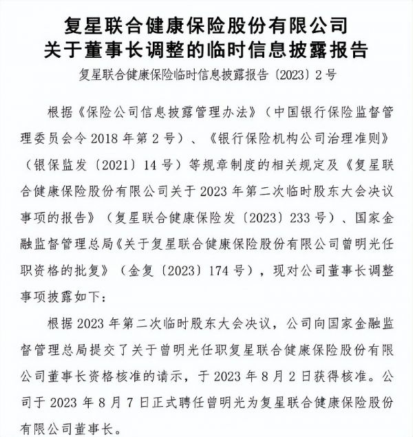 值得一提的是,復(fù)星聯(lián)合健康保險(xiǎn)成立之初,曾明光獲批出任公司總裁。