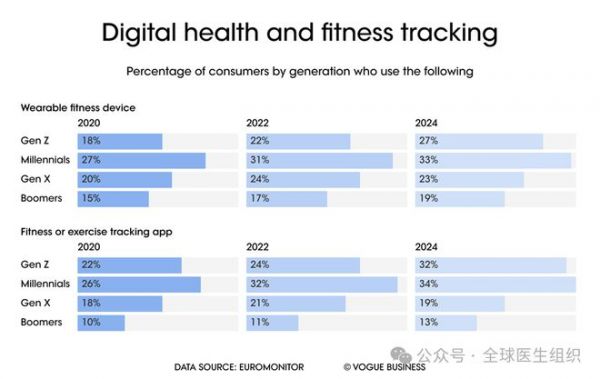 在這一趨勢下,數(shù)字健康和可穿戴示蹤設備的需求顯著增長。2024年,27%的Z世代和33%的千禧一代佩戴可穿戴健康示蹤設備,報告預測2024年至2026年間,智能可穿戴設備將實現(xiàn)兩位數(shù)增長,主要是為用戶提供從運動、血糖水平到睡眠、荷爾蒙和壓力周期等各方面的實時數(shù)據(jù)監(jiān)測和個性化分析。
