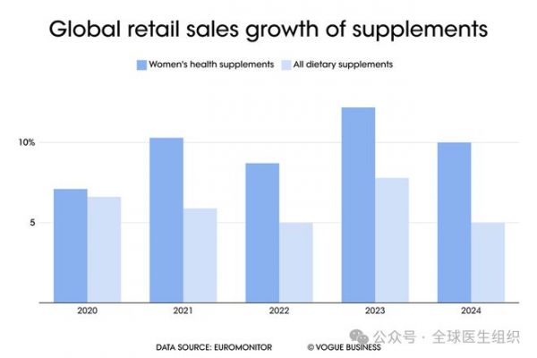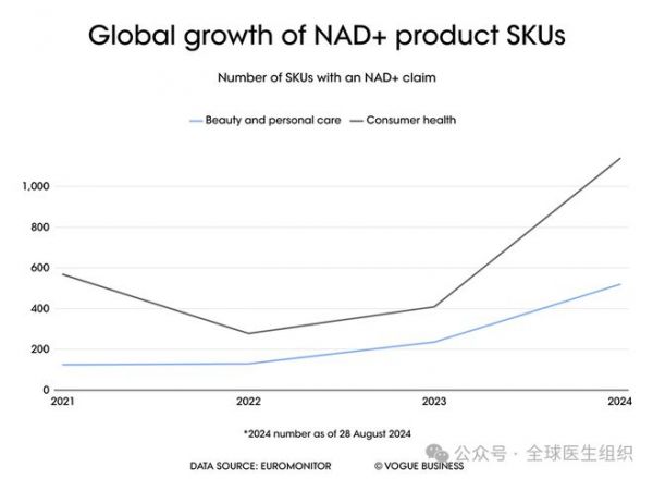 此外,保健品補充劑市場也在蓬勃發(fā)展。預計全球維生素和補充劑的銷售額將從2024年的1272億美元增至2025年的1399億美元。其中,NAD+作為一種輔酶,因其支持皮膚細胞修復和完整性功效,受到女性的青睞。截至2024年8月,標有“NAD+”的保健品數(shù)量從409種增至1137種,幾乎增加了兩倍(由此可見魚龍混雜,參差不齊)。