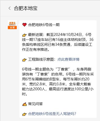 溫馨提示:微信搜索公眾號【合肥本地寶】,關(guān)注后在聊天對話框回復(fù)【6號線】即可獲取合肥地鐵6號線建設(shè)最新進(jìn)展、線路圖、站點分布、通車時間等!