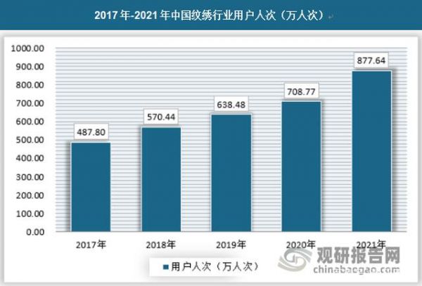 我國(guó)紋繡行業(yè)的用戶人次持續(xù)上升,在2021年升至877.64萬人次。