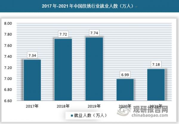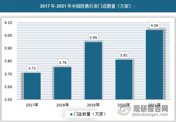 我國(guó)紋繡行業(yè)門店數(shù)量在2021年達(dá)到4.04萬家,就業(yè)人數(shù)降低至7.18萬人。