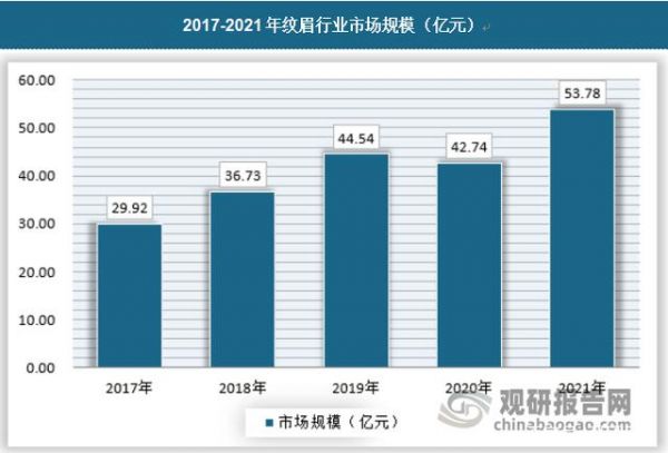 細(xì)分市場(chǎng)中,紋眉占比比較大,紋眉價(jià)格較高,導(dǎo)致紋眉市場(chǎng)規(guī)模占整個(gè)紋繡行業(yè)的大頭。紋眉市場(chǎng)在2021年達(dá)到53.73億元。