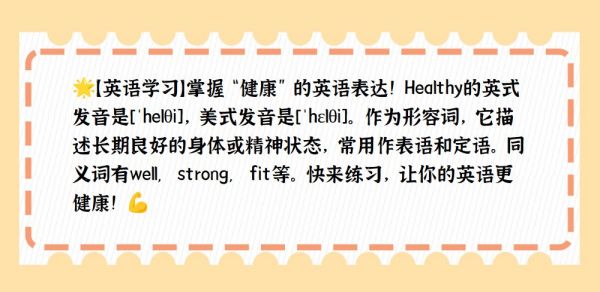 Hey,朋友們!今天來給大家分享一下“健康”在英語中的讀音。這個詞是“healthy”。它的英式發(fā)音是 [?helθi],而美式發(fā)音則是 [?h?lθi]。記住這個發(fā)音,下次在用到“健康”這個概念時,你可以自信地用英語表達啦!
