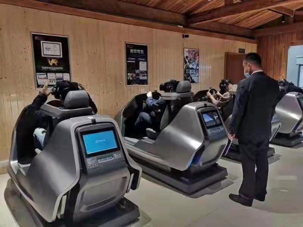 在VR智能輔助駕駛培訓(xùn)模擬訓(xùn)練教室里,記者看到了最新款的VR輔助模擬器,操作人員頭戴VR頭盔演示學(xué)駕操作,科技感十足。