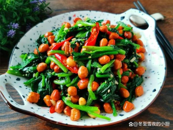 【果仁菠菜】所需材料:菠菜500克、花生米1小碗、油鹽適量、香油1湯匙、大蒜2瓣、干辣椒10個、生抽1湯匙、白糖半湯匙、米醋1湯匙、