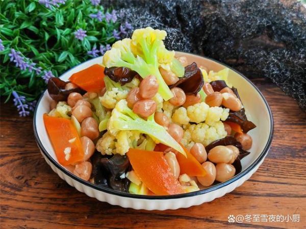 【花菜拌花生】所需材料:花菜半顆、花生米1碗、木耳適量、胡蘿卜1段、油鹽適量、香油1湯匙、花椒20-30粒、八角2個、味精少許、