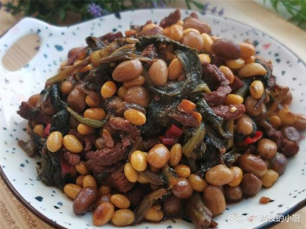 【雪里蕻燜黃豆花生米】所需材料:腌制雪里蕻1斤、花生米1小碗、黃豆1小碗、豬肉100克、小米辣2-3個、油鹽適量、蔥1段、姜2片、大蒜2瓣、十三香1茶匙、白糖少許、生抽1湯匙、老抽半湯匙、