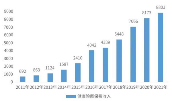 從行業(yè)規(guī)模來看,我國健康險從2011年的692億元增長到2021年的8803億元,保持平均每年超過30%的年復合增長率。