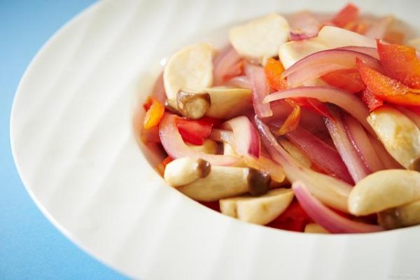 2、鍋內(nèi)倒油,油熱后將辣椒倒入炒香,再放入洋蔥炒片刻,放入鹽、白糖、味精,最后加入白醋、陳醋,翻炒均勻即可出鍋。