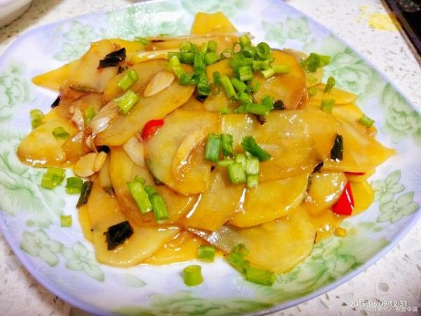2、土豆去皮洗凈,放入鍋里加入清水,上火煮沸,加上鍋蓋把土豆煮至嫩熟為止(不要煮得太熟,以免炒時(shí)土豆碎爛)。把煮好的土豆晾涼,切成小薄片。