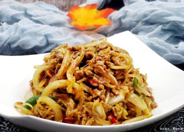 2、鍋內(nèi)倒油,燒至六成熱,下入漿好的牛肉絲,用筷子劃開,約2~3分鐘后,炒至牛肉絲八成熟時(shí),撈出控油;原鍋內(nèi)留適量油,燒至七成熱,下入洋蔥絲,快速煸炒,見洋蔥絲變色、呈透明狀時(shí),加入料酒、醬油、鹽和少許高湯,燒開,放入炒好的牛肉絲,放進(jìn)味精,用濕淀粉勾芡,顛翻均勻即可。