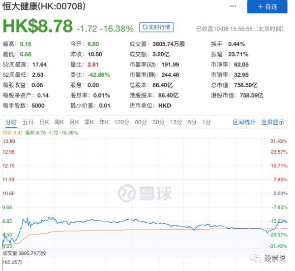 昨晚,恒大健康公告后,今天股價(jià)一瀉千里,暴跌30%開(kāi)盤(pán),截至收盤(pán),跌幅16.38%,市值增發(fā)148億!