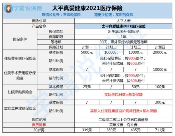太平真愛健康2021醫(yī)療保險(xiǎn)是由太平人壽保險(xiǎn)公司推出的一款醫(yī)療保險(xiǎn),分為四個(gè)保障計(jì)劃,投保年齡為出生滿28天到60周歲,保障期限為1年。