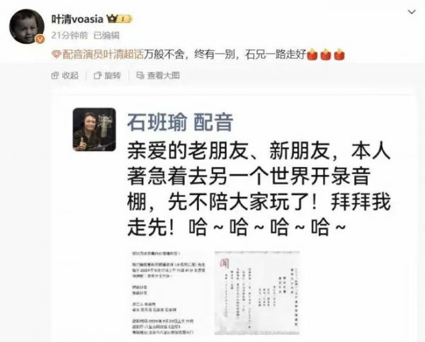 石班瑜離世界的消息,最先是從配音員葉清空中傳出,隨后傳媒經(jīng)過證實(shí),石班瑜離世的消息屬實(shí)。