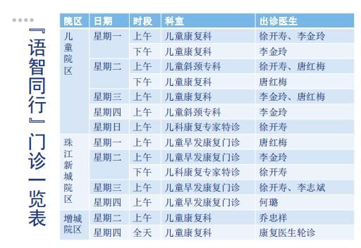 日前,廣州婦女兒童醫(yī)療中心兒童康復(fù)科“語(yǔ)智同行”門(mén)診開(kāi)診,廣州市婦女兒童醫(yī)療中心康復(fù)科語(yǔ)言治療師洪小霞老師告訴我們,“語(yǔ)智同行”門(mén)診可以對(duì)言語(yǔ)語(yǔ)言功能異常的患兒進(jìn)行快速篩查,并通過(guò)語(yǔ)言能力評(píng)定言語(yǔ)功能評(píng)定溝通發(fā)展測(cè)試認(rèn)知/發(fā)育水平測(cè)試,以及詞匯、語(yǔ)法、句式等的認(rèn)知理解、發(fā)音器官的功能訓(xùn)練、非侵入性腦刺激技術(shù)、創(chuàng)新輔助技術(shù)等方式進(jìn)行對(duì)癥干預(yù)。家長(zhǎng)可以通過(guò)微信公眾號(hào)搜索“廣州婦兒中心” 進(jìn)行預(yù)約掛號(hào),預(yù)約流程與出診醫(yī)生如下: